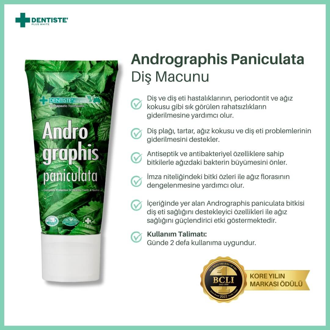 DENTISTE’ Andrographis Paniculata Diş Macunu, gerçek Andrographis Paniculata Özü ile zenginleştirilmiş formülünün yanı sıra, Mastik sakızı ve Çinko iyon teknolojisi de içerir. Ayrıca ürünün içeriği Dentiste’nin imza niteliğindeki doğal bitki özlerini içerir.