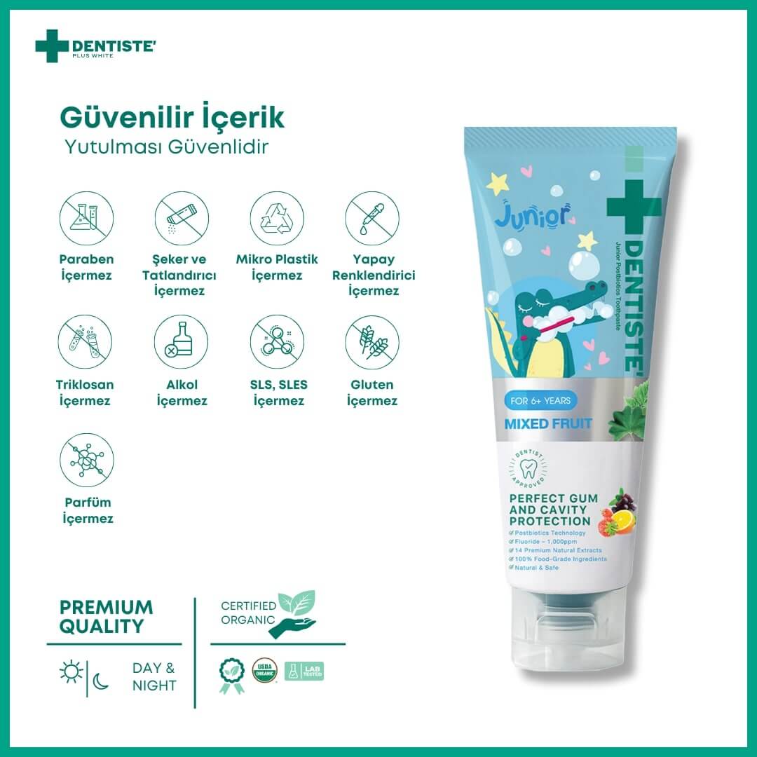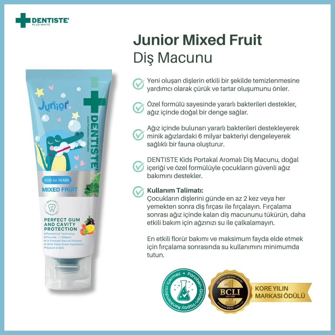 Dentiste Junior Karışık Meyve Aromalı Diş Macunu, sadece ağız sağlığını desteklemekle kalmaz, aynı zamanda çocuklar için lezzetli bir deneyim sunar. Asit erozyonunu azaltır, pediyatrik diş eti hastalıkları ve iltihaplarını önlemeye yardımcı olur. Plak, leke ve tartar oluşumunu engelleyerek çocukların ağız sağlığını korumaya odaklanır.